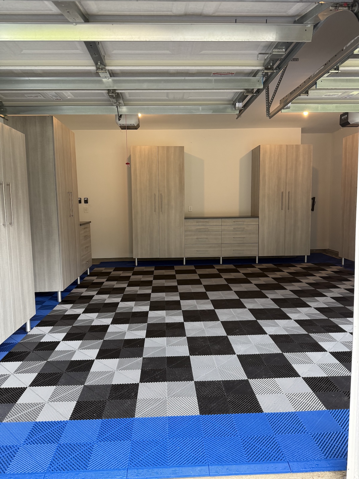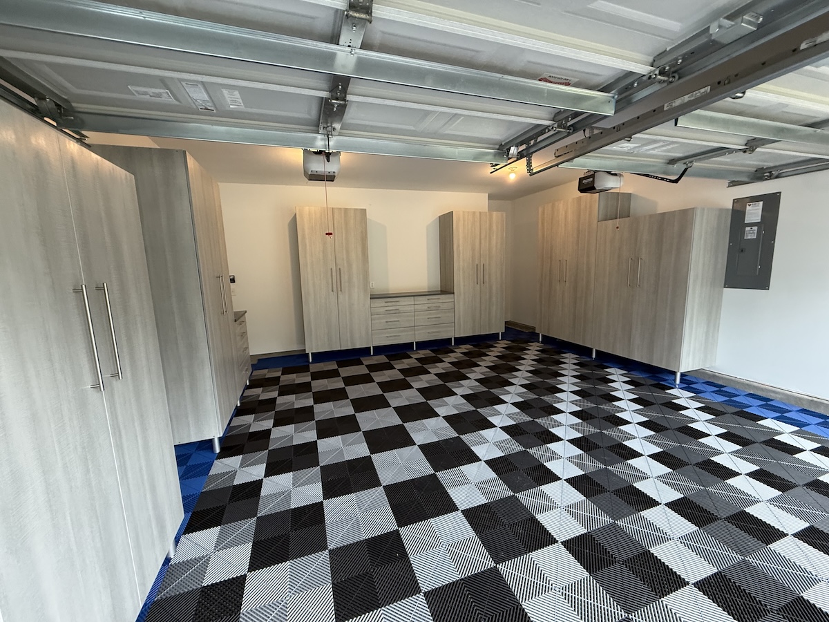 To complement the cabinetry, the client selected Swisstrax flooring for its unique color and pattern. The interlocking tile system instantly elevated the space, delivering both visual impact and easy maintenance. Together, the closed storage and Swisstrax floor create a garage that feels polished, modern, and effortlessly organized—a standout upgrade for this Myrtle Beach, SC home.