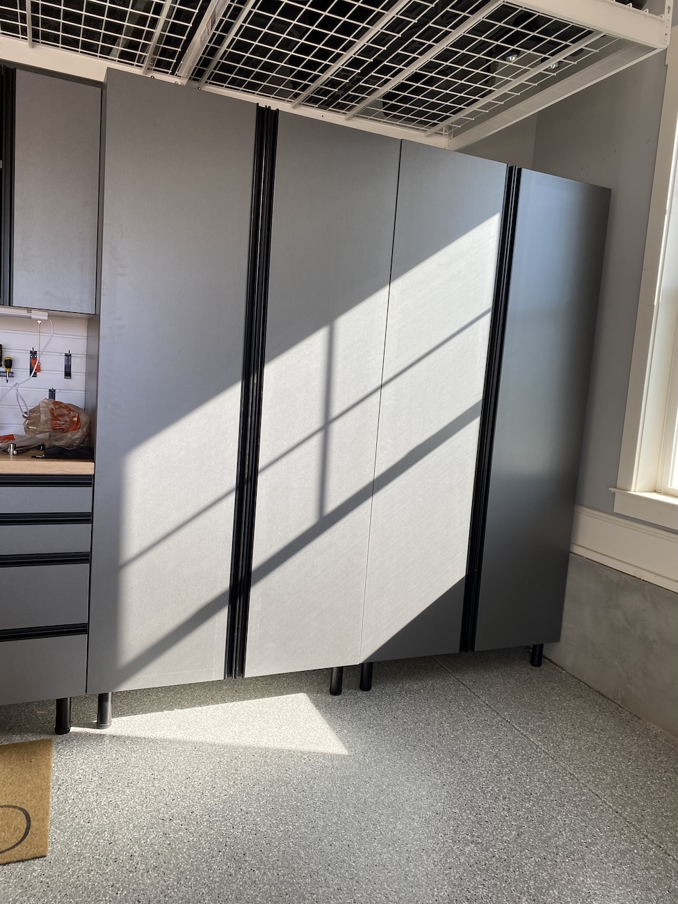 We installed cabinets with extruded handles to prevent snags—an important detail in a hands-on workspace—along with slatwall for quick access to frequently used tools. Durable flooring completes the setup, providing an easy-to-clean surface that stands up to daily use. The result is a streamlined, practical workshop that’s perfectly tailored to this homeowner’s needs in Little River, SC.