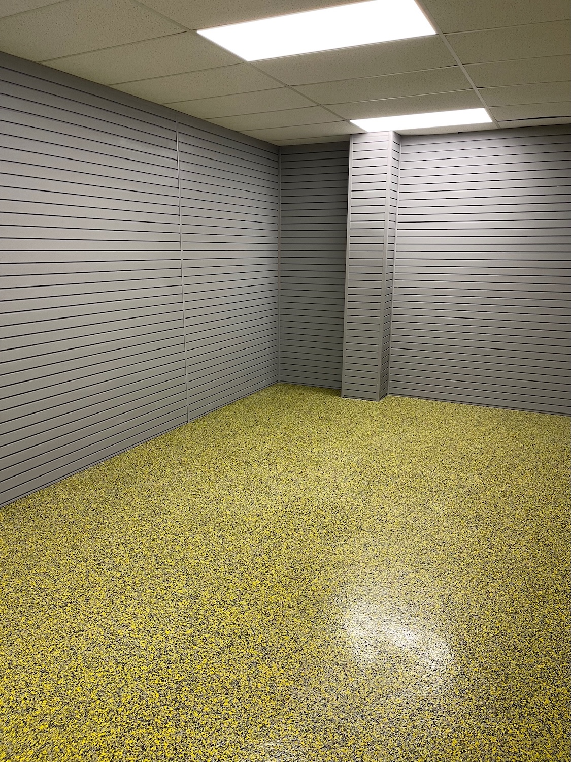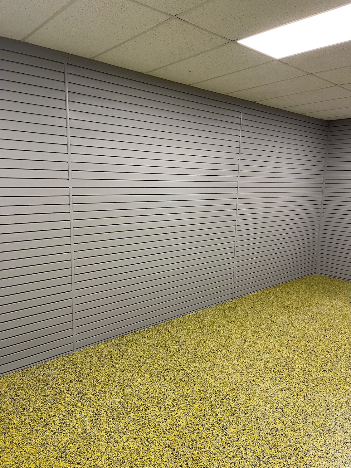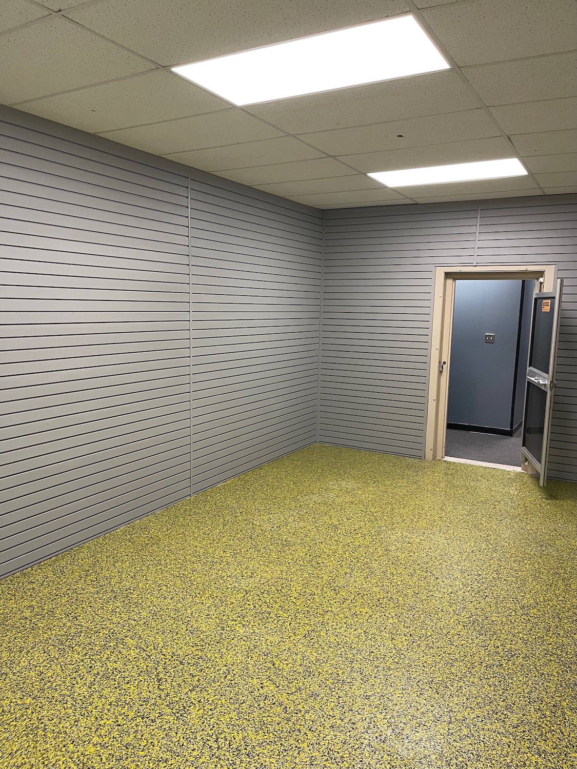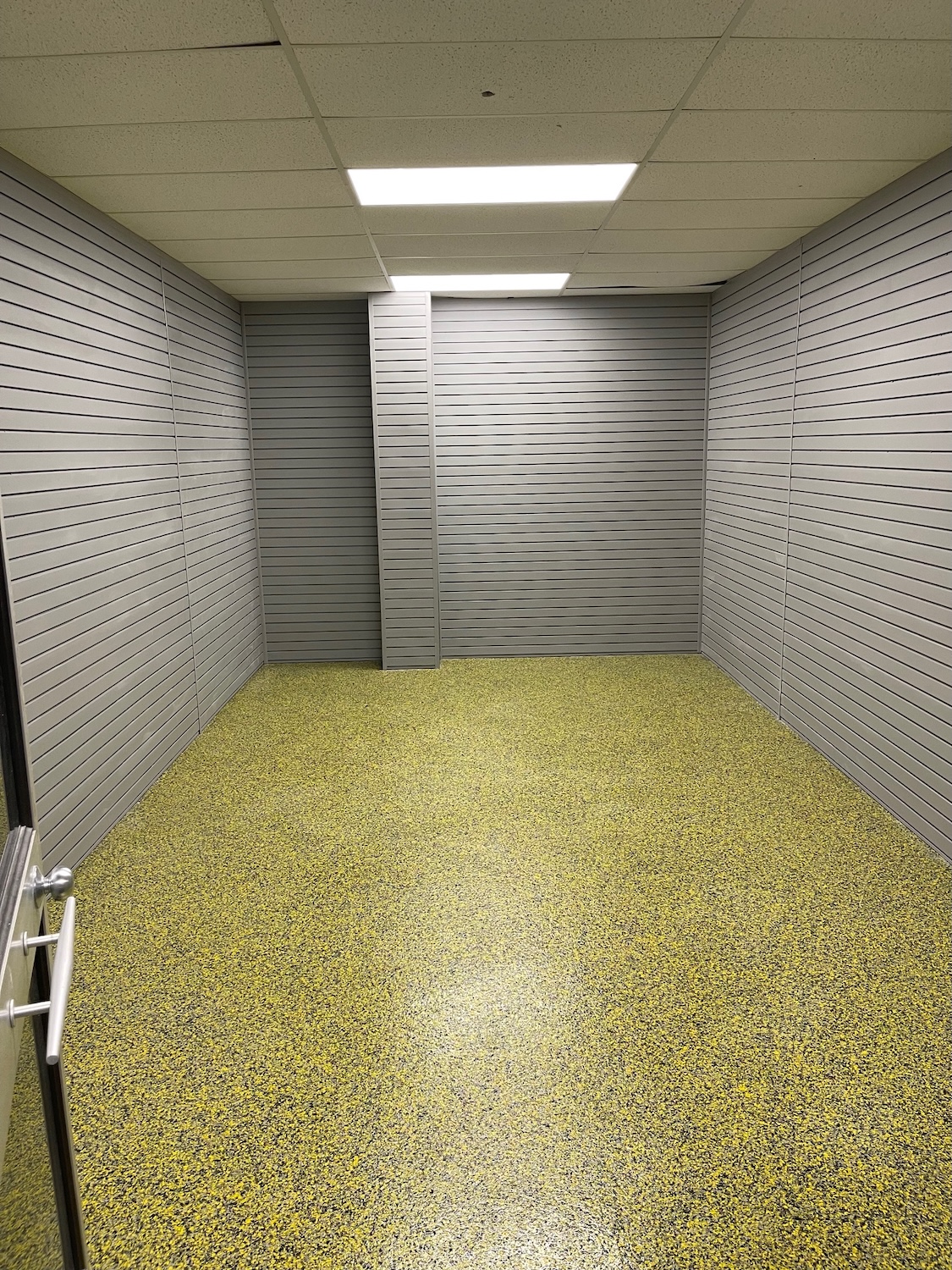 We installed a custom-colored floor designed to match the company’s branding, instantly giving the space a cohesive, intentional look. To make the room practical for day-to-day use, we also outfitted the walls with slatwall, allowing the team to display merchandise securely and cleanly within the former vault. The result is a creative commercial solution that turns a once-overbuilt space into a unique asset for this Irmo, SC business.