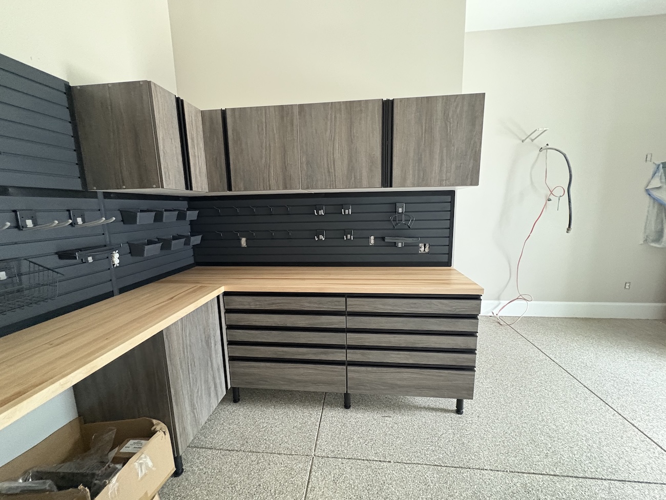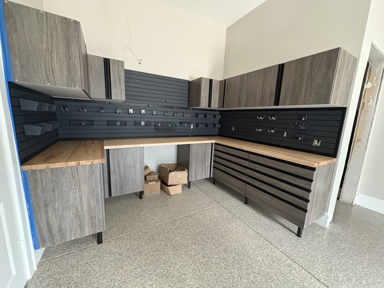 We installed cabinets for closed storage to keep smaller items neatly tucked away, paired with slatwall to organize tools and frequently used accessories within arm’s reach. Durable flooring completed the space, providing an easy-to-clean surface that stands up to daily use and creative messes. The result is a garage that functions as a personal workshop—perfectly tailored to this homeowner’s hobbies in Pawleys Island, SC.