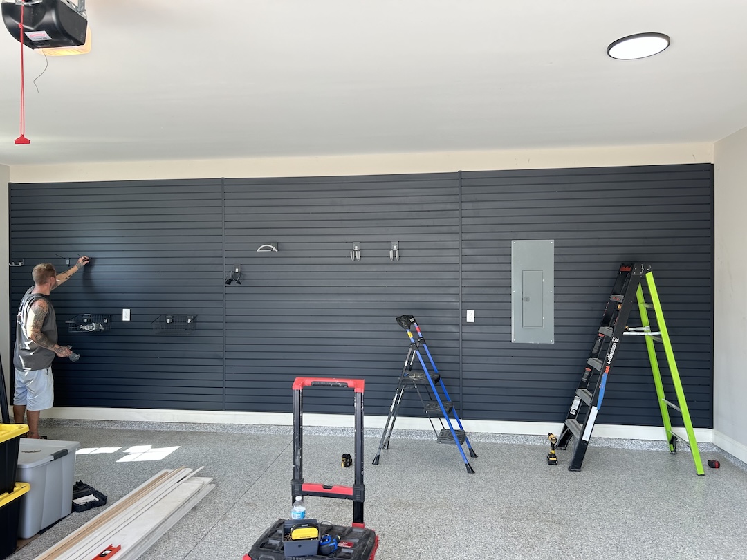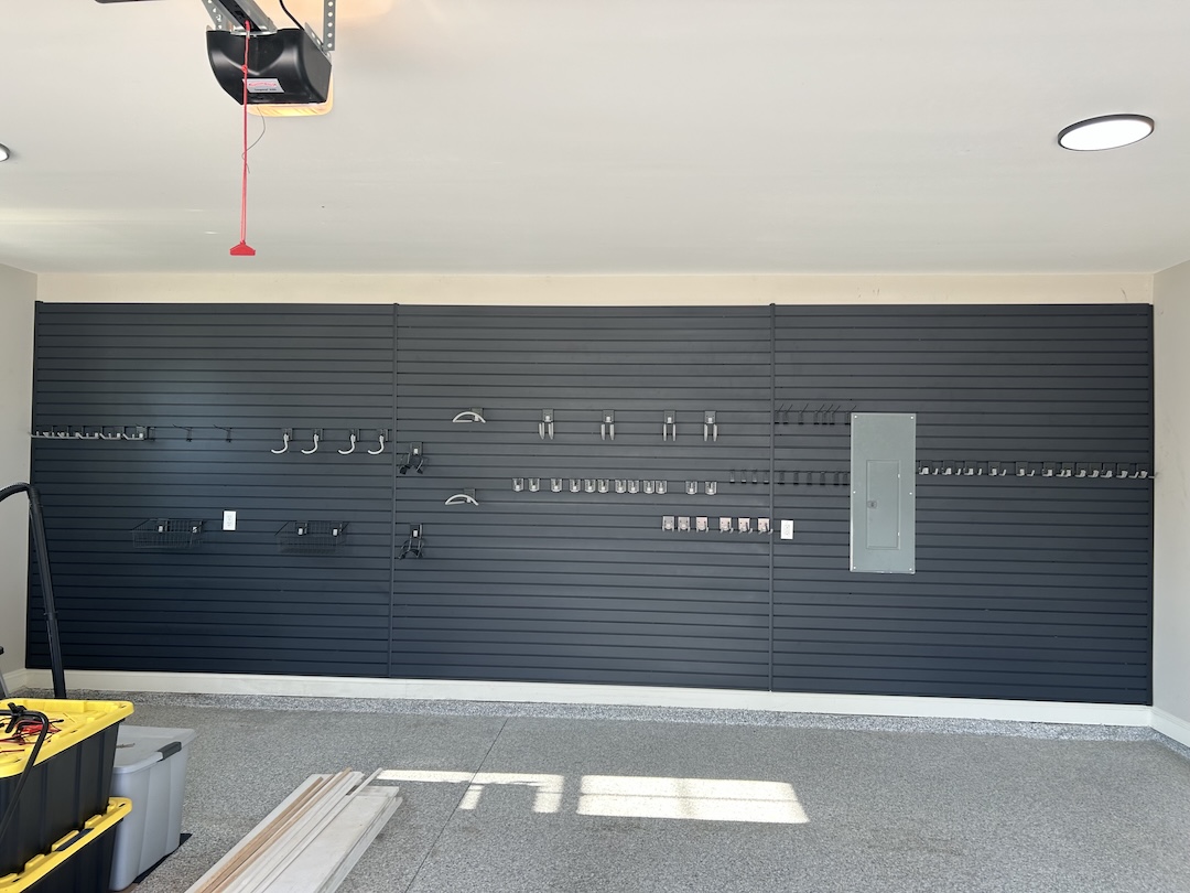 This installation maximized wall space without cluttering the floor, giving the homeowner a sleek, functional setup. With hooks and accessories, the slatwall makes it easy to hang bulky items while keeping the garage open, tidy, and ready for both cars and activities.